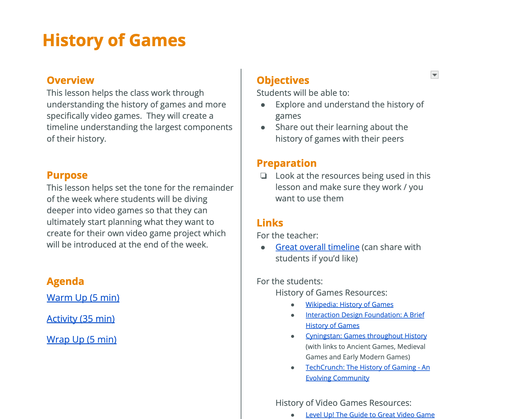 This lesson helps set the tone for the remainder of the week where students will be diving deeper into video games so that they can ultimately start planning what they want to create for their own video game project which will be introduced at the end of the week.