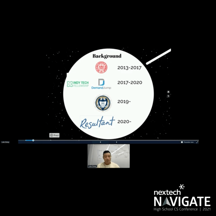 This is a recorded session from Nextech Navigate 2021, a virtual conference for Indiana high school students. Luke Zhang is the presenter.