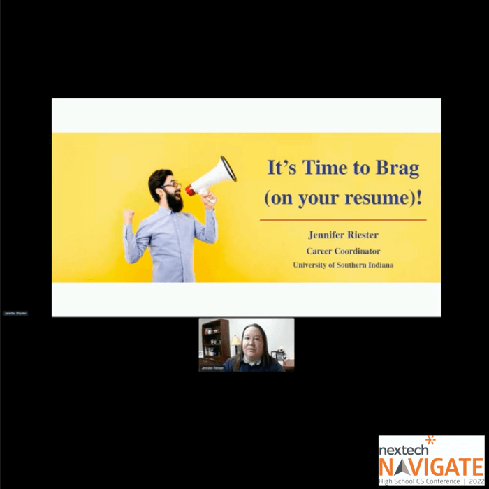 This is a recorded session from Nextech Navigate 2022, a virtual conference for Indiana high school students. Jennifer Riester is the presenter.
