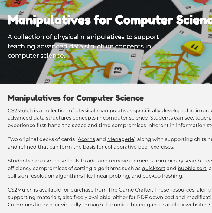 The CS2 Mulch website provides amazing resources for each sorting algorithm and binary search tree algorithms.  Each algorithm’s page includes: